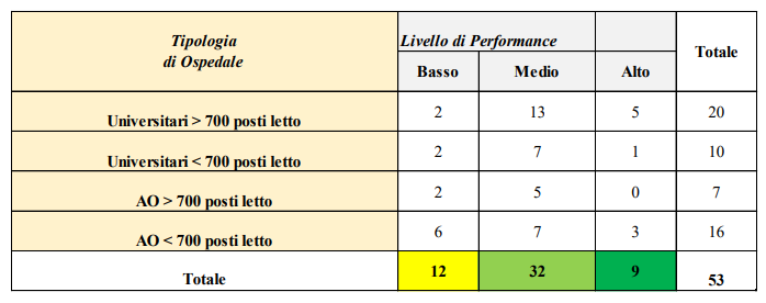 La metodologia vede l’individuazione di cinque aree di performance e la suddivisione delle 53 Aziende Ospedaliere in due tipologie: Aziende Ospedaliere Universitarie (30) e Aziende Ospedaliere (23). Inoltre, per entrambe le categorie, è stata prevista una differenziazione secondo il numero di posti letto disponibili, ovvero maggiore/minore di 700 posti letto.