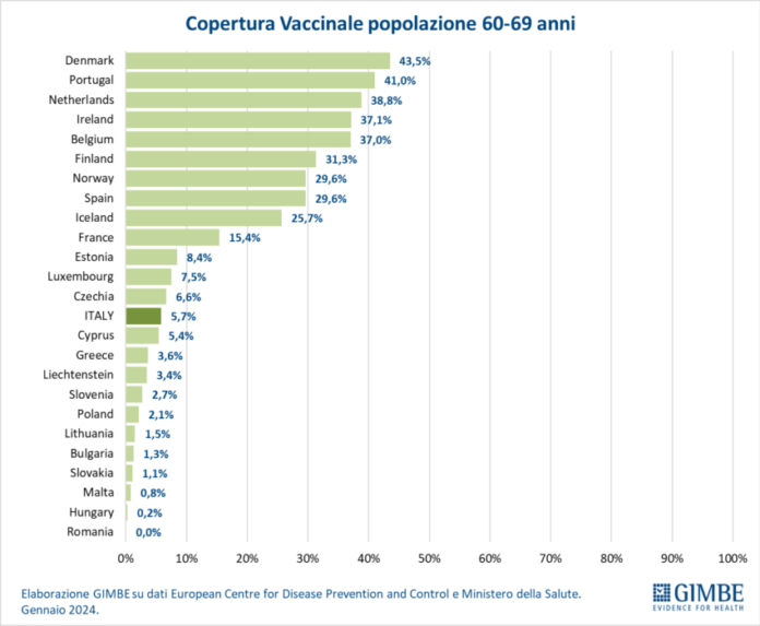 60-69 anni. Nella fascia 60-69 anni, con una copertura nazionale del 5,7%, l’Italia si colloca al 14° posto. 13 paesi hanno raggiunto coperture superiori a quelle dell’Italia: dal 6,6% della Repubblica Ceca al 43,5% della Danimarca. 11 paesi hanno raggiunto invece coperture inferiori alle nostre: dal 5,4% di Cipro allo 0% della Romania (Figura 1).
