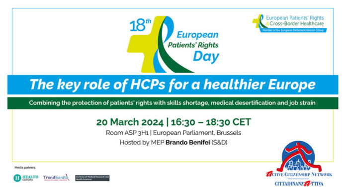 La celebrazione europea della Giornata Europea dei Diritti dei Pazienti, dal titolo “Il ruolo chiave dei professionisti sanitari per un’Europa più sana. Abbinare la protezione dei diritti dei pazienti con la carenza di competenze, la desertificazione medica e lo stress lavorativo” si terrà presso il Parlamento Europeo a Bruxelles il 20 marzo 2024 dalle 16:30 alle 18:30 nella Sala ASP 3H1, gentilmente ospitata dal membro del Parlamento UE Brando Benifei (S&D) e organizzata con il sostegno del Gruppo di Interesse “European Patients’ Rights and Cross-border Healthcare”.