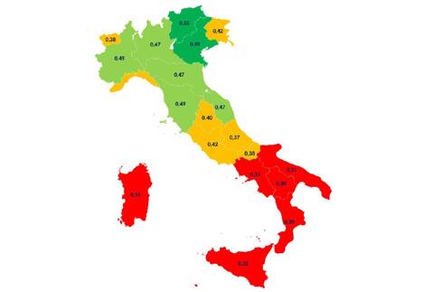 Veneto, Trento e Bolzano hanno ottenuto il miglior risultato 2023 (con punteggi che superano la soglia del 50% del risultato massimo ottenibile, rispettivamente: 59%, 55% e 52%).